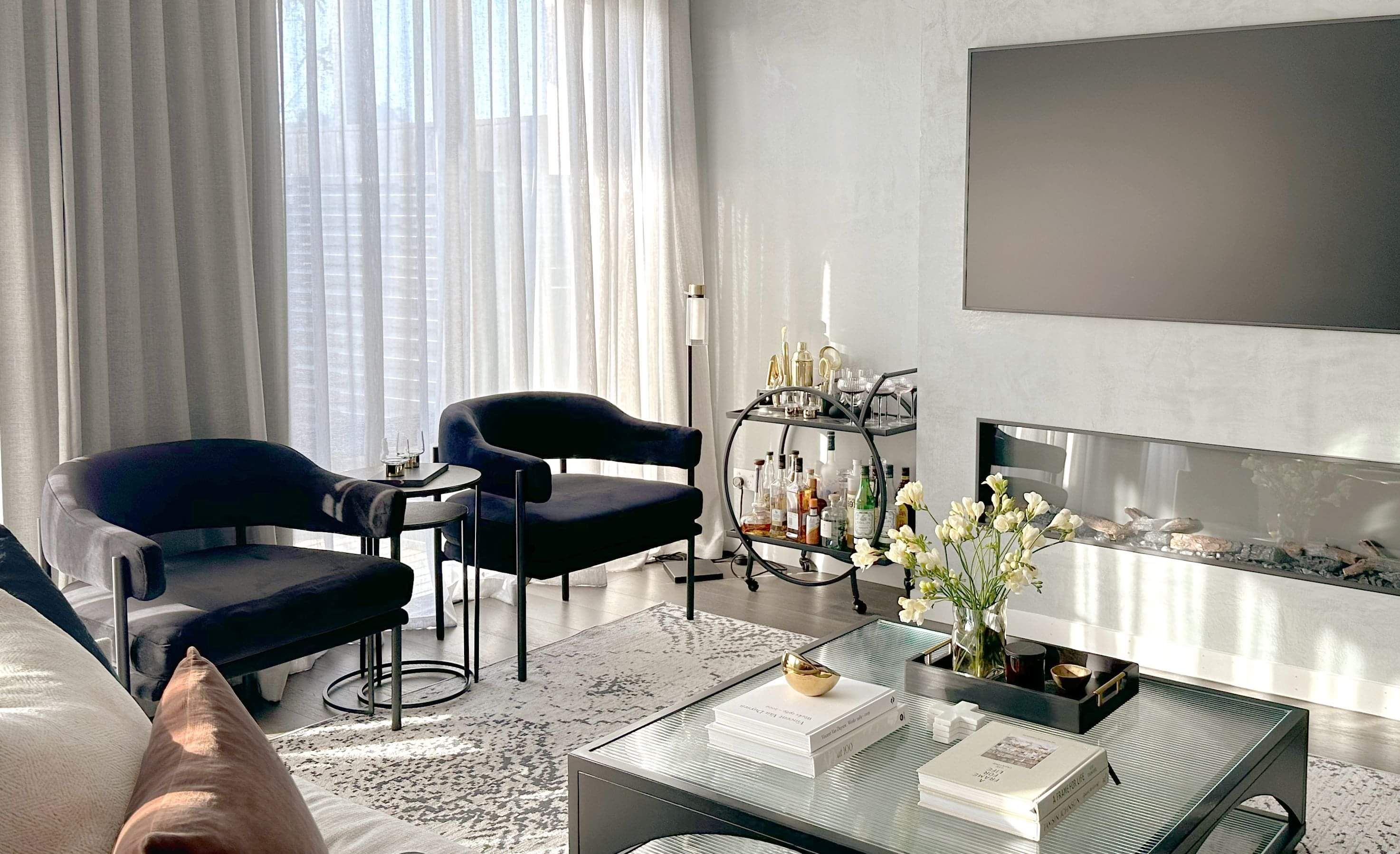 While one of the couple loved colour and elegant glamour, the other preferred more urban utilitarian comfort. Balancing their tastes and preferences guided our approach. Deep wall paint is softened by elegant sheers; brass, deep blue and ochre accents are balanced with a concrete-look finish to the fireplace front where the new electric fireplace creates a cozy focus for guests to gather around.